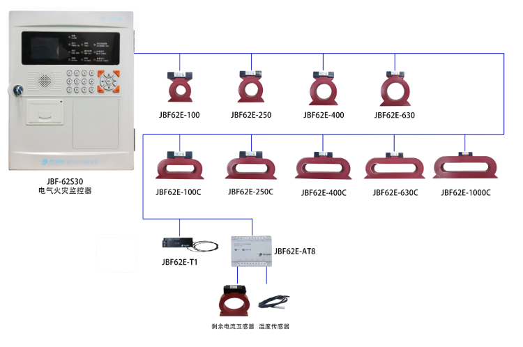JBF-62S30电气火灾系统由JBF-62S30型电气火灾监控设备,JBF62E系列组合式电气火灾监控探测器、JBF62E-AT8组合式电气火灾监控探测器(分体式)、JBF62E-T1测温式电气火灾监控探测器组成,通过监控设备和现场部件组成的电气火灾监控系统对被保护线路的漏电流值和温度值进行实时监控。